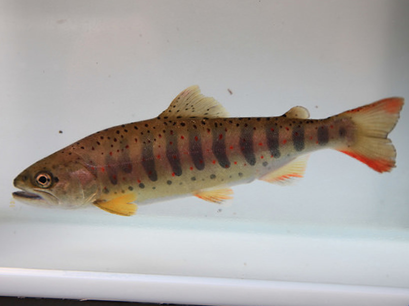 (1)右手養魚センターでは、石垣で囲まれた自然の川で渓流釣りを体験できます。